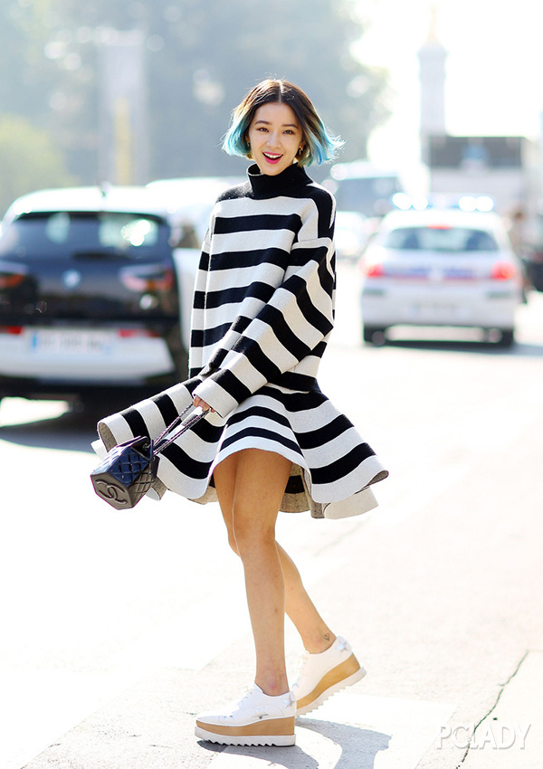 Irene Kim街拍搭配:上衣:Hoeohwan Smulation;短裙:Chanel;厚底鞋:Stella McCartney;手包:Irene X Play No More。