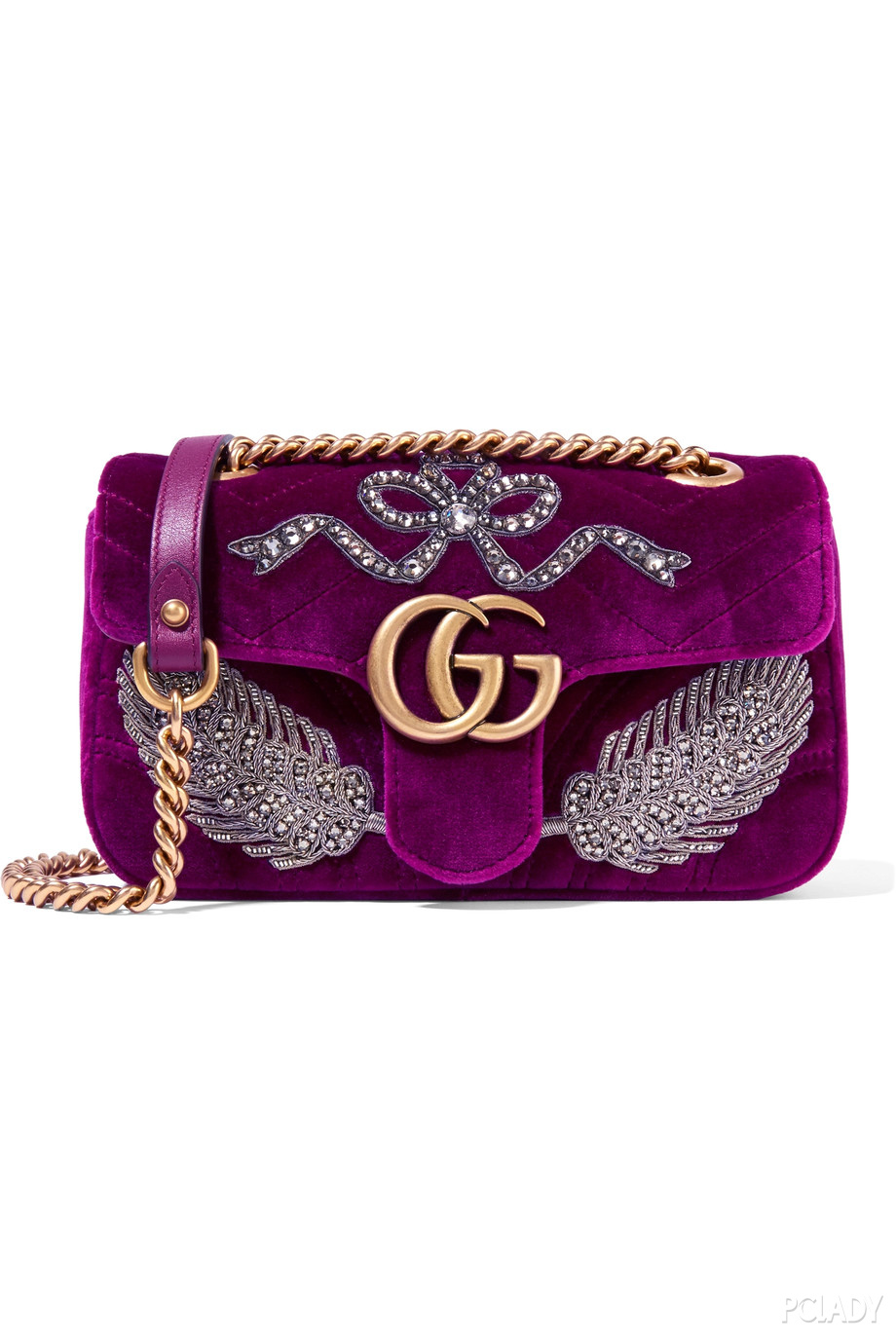 Gucci 这款“Marmont” 单肩包是品牌创意总监 Alessandro Michele 最为经典的设计之一,自 2016 年早秋亮相以来,演绎出不同的款式特色。这一版本采用绗缝梅紫色天鹅绒制成,并以施华洛世奇水晶、珠饰和金属感刺绣装饰着蝴蝶结和羽毛图案。