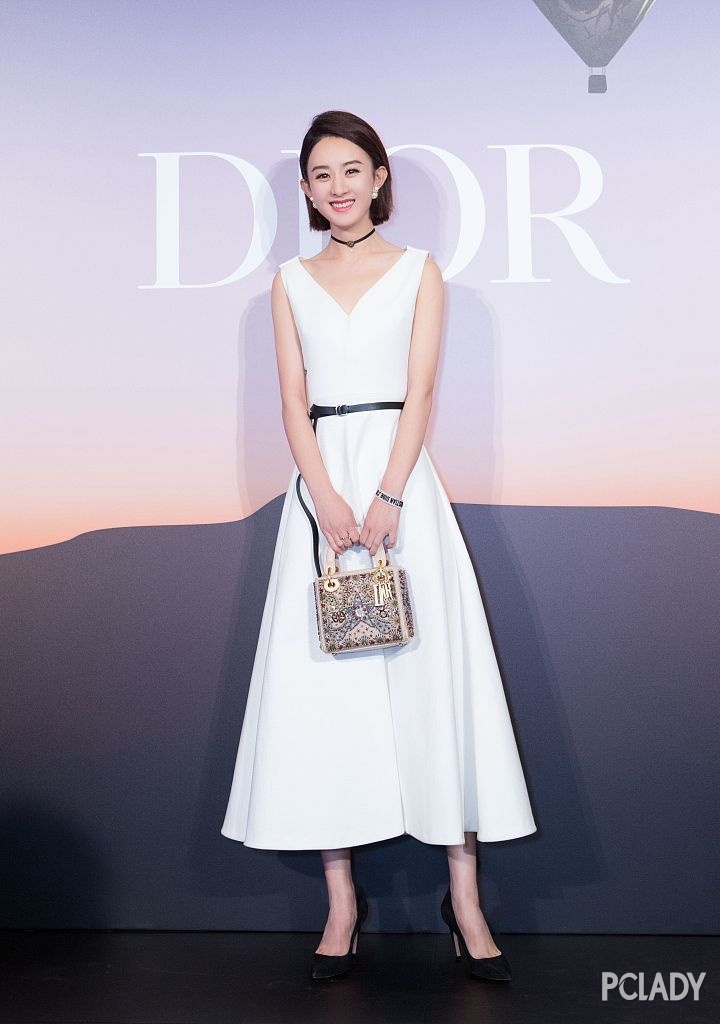 赵丽颖偏好浅色系的Dior军服,她自己气质温柔、长相可爱,白色的花朵刺绣V领裸色纱裙,容易陪衬出她柔美的气息。