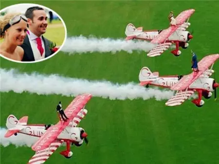 英国格洛斯特郡,在教区牧师的引领下,新郎和新娘各自站立在一架飞机上,随着婚礼进行曲的开始,三架飞机缓缓升空,幸福的一对在高空中举行了他们难忘的婚礼仪式。